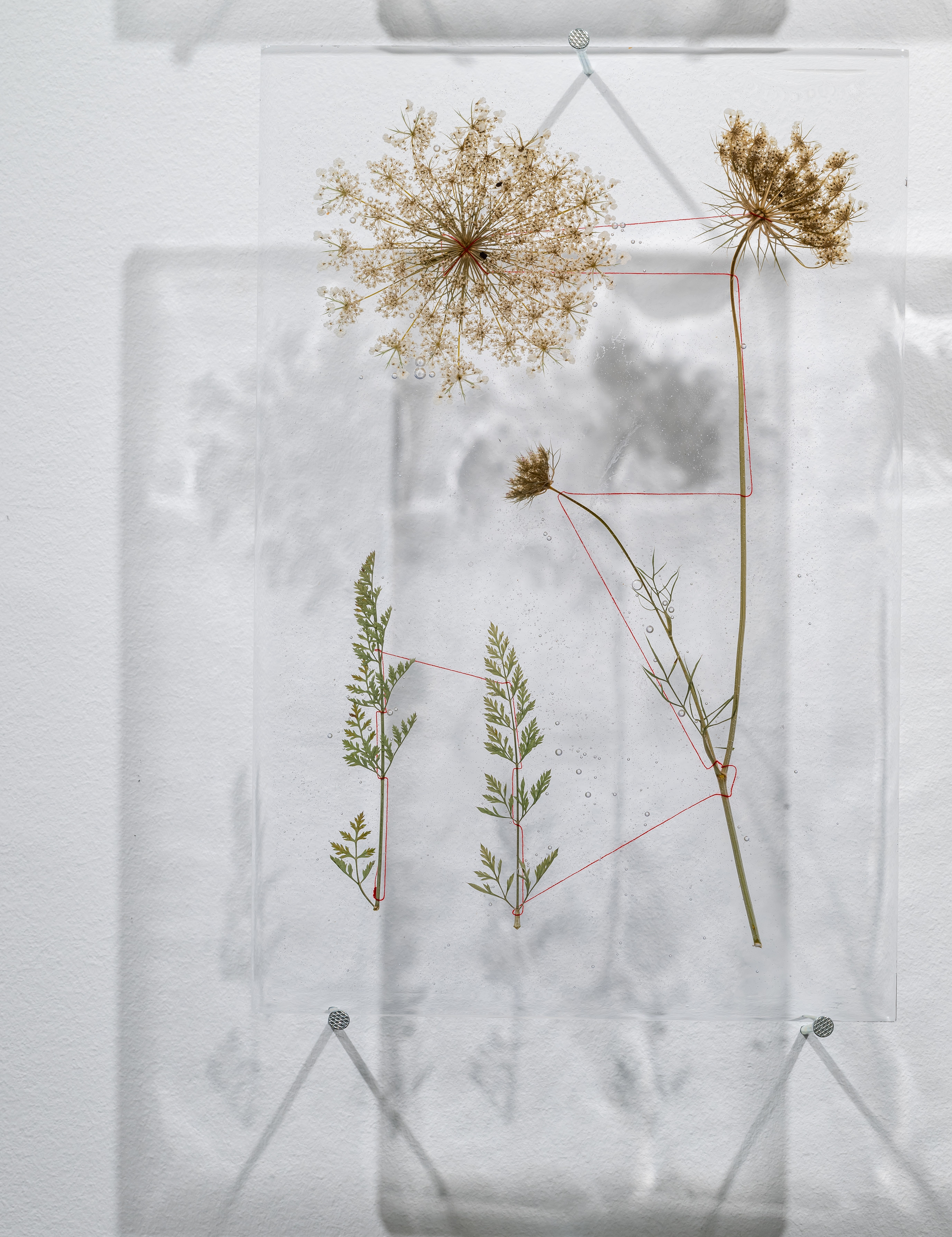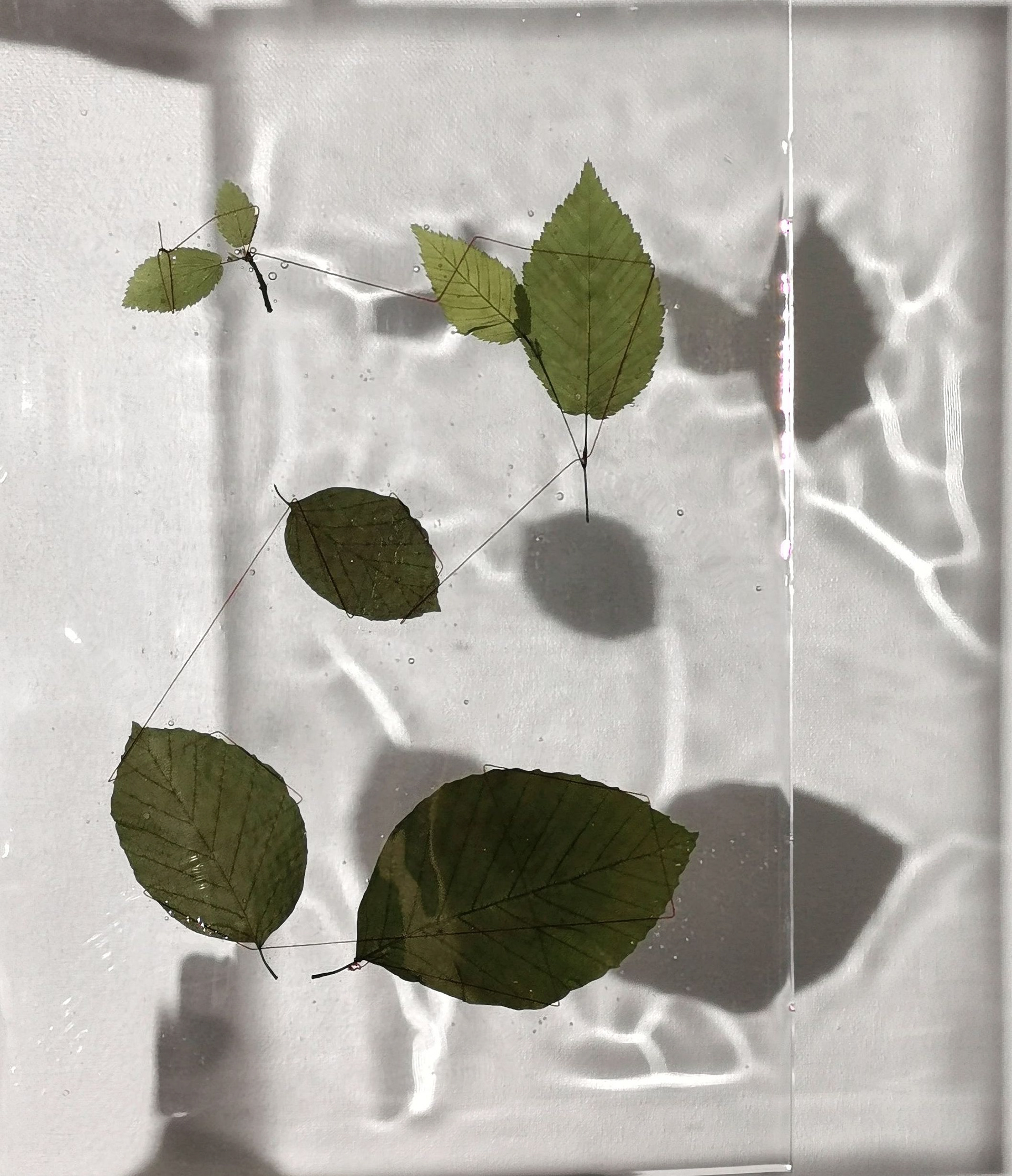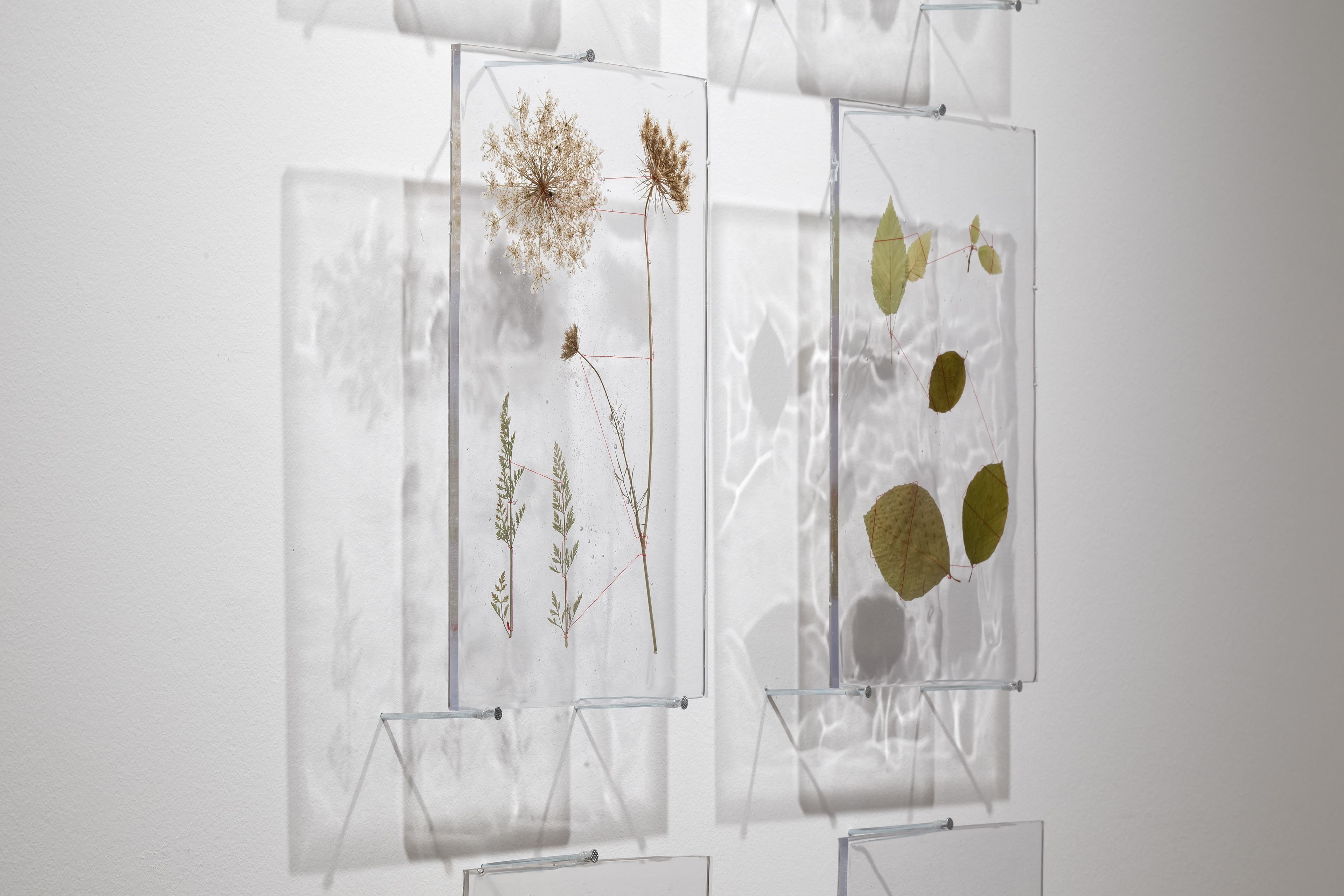 I am showing pieces from my series “Plants from My Mother’s Forest”, which is part of the larger body of work In My Mother’s Forest. In this series, I press plants collected from my mother’s forest and sew them onto transparent foil, which is then cast in resin.
