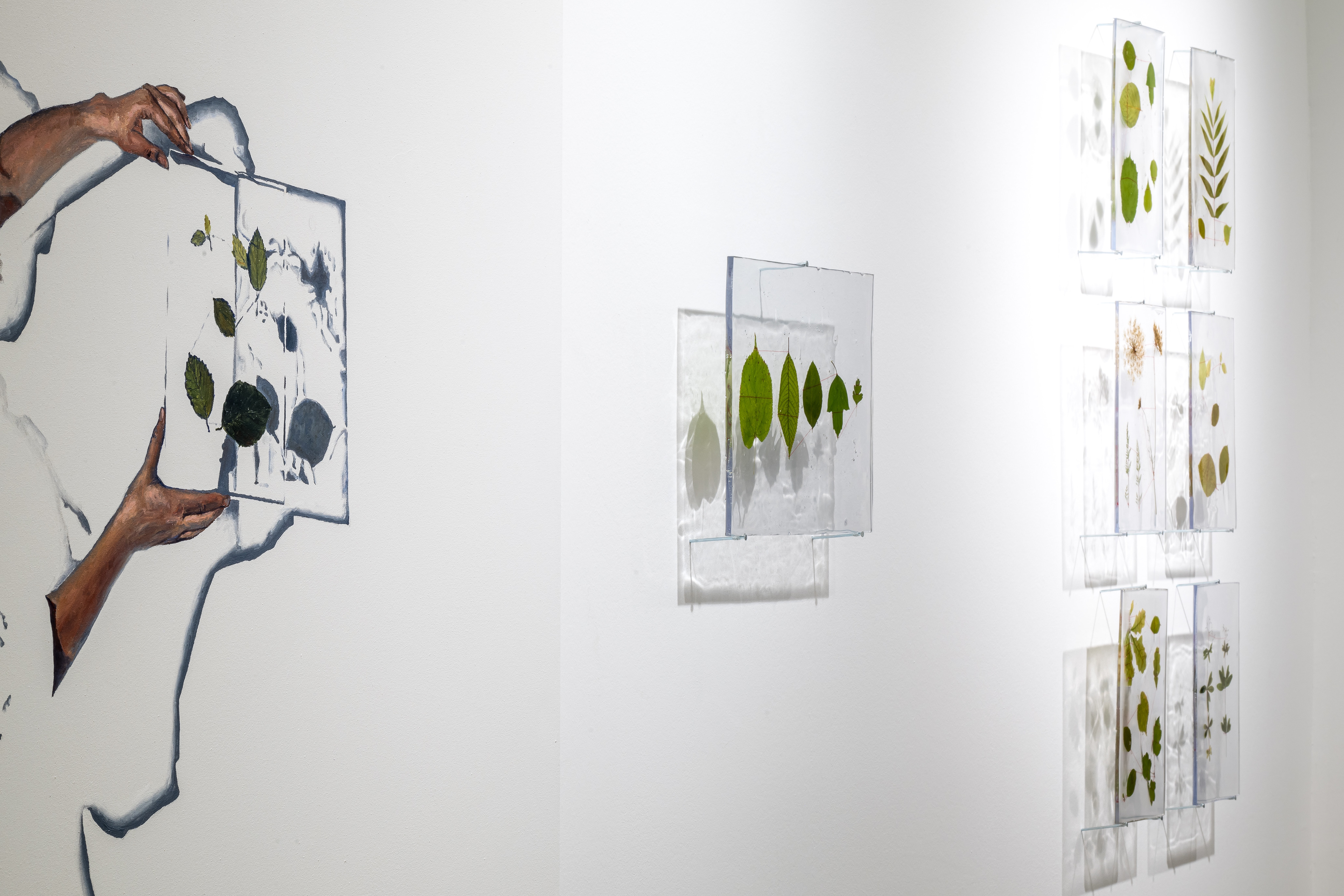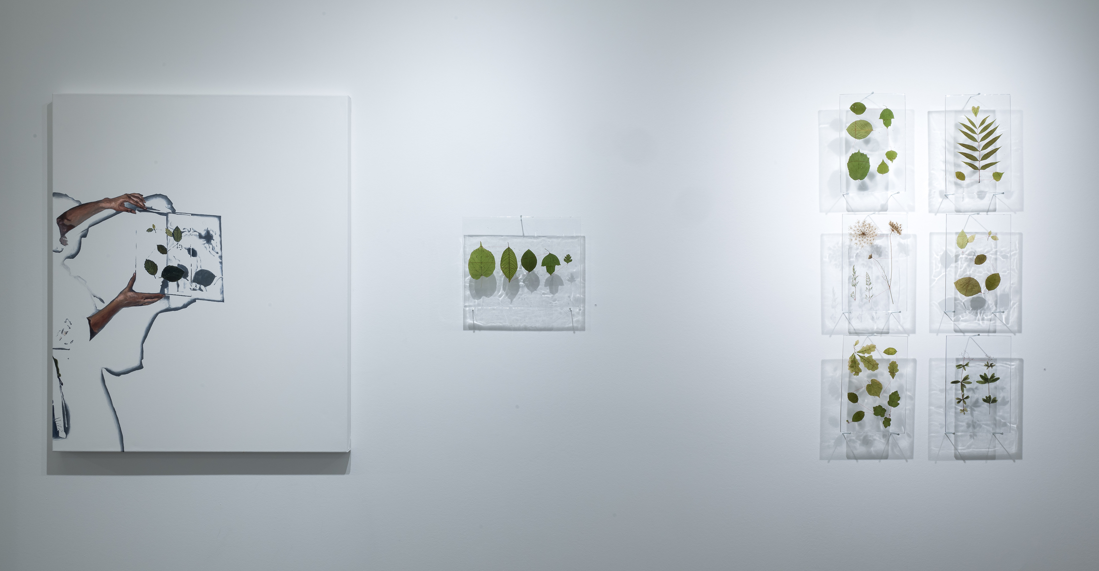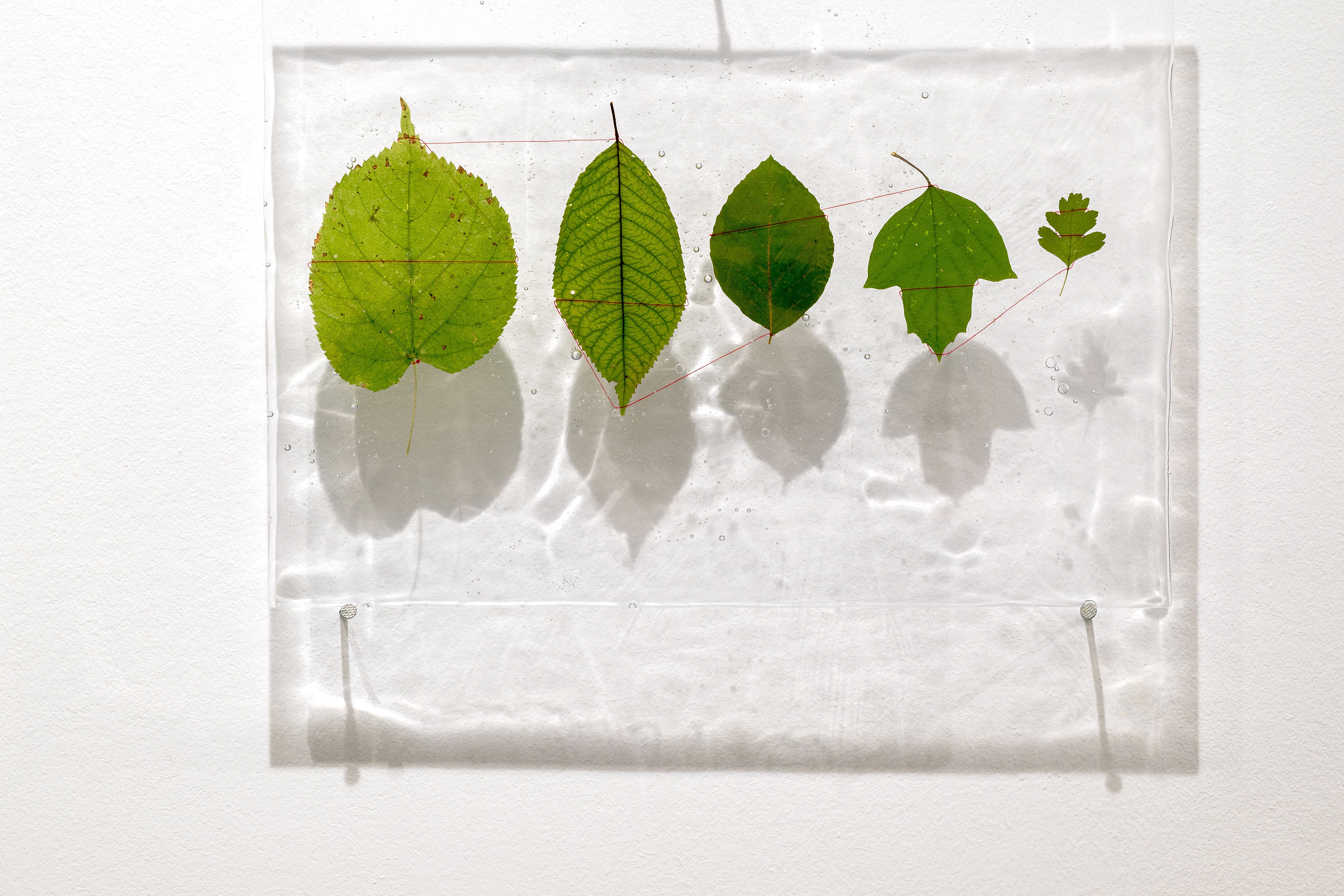 I am showing pieces from my series “Plants from My Mother’s Forest”, which is part of the larger body of work In My Mother’s Forest. In this series, I press plants collected from my mother’s forest and sew them onto transparent foil, which is then cast in resin.